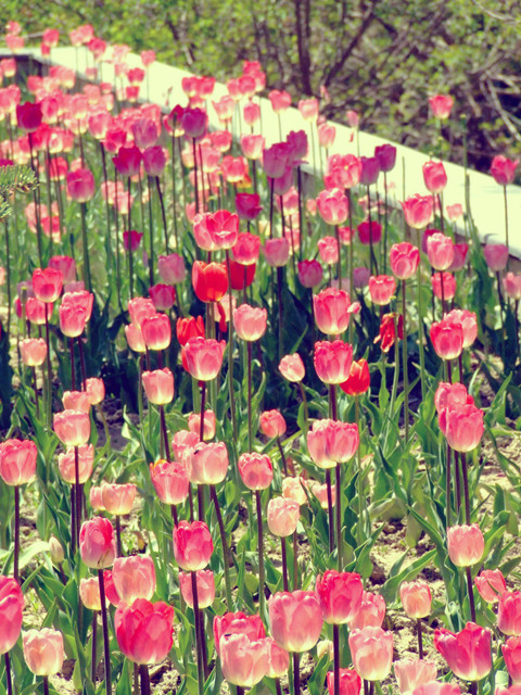 昆仑公园里开着饱实的郁金香,这是第一次见着这样满满一片郁金香。记得小时候喜欢郁金香多是因他被奉为高贵的品性,而后来渐渐长大,他那独特的外型并不符合自己的审美,便慢慢地远视了他,今天,在绿荫阳光下,这成片的郁金香,有玉白、鲜红、鹅黄等等,他那美,才第一次被你欣赏,故说这世间并无美和丑之分,这分分区别的,可不是我的眼和心么?
