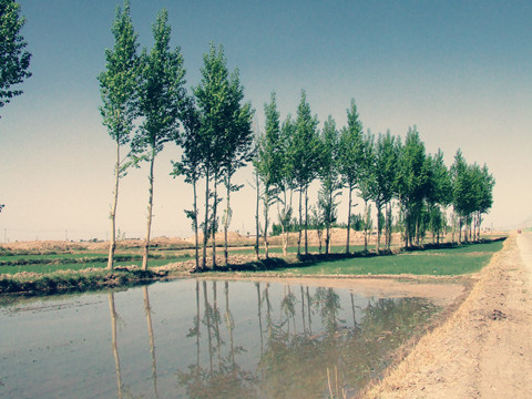格尔木城的路边摆满了回民的小摊,大多水果、凉皮酸奶的小摊之类,相互拥挤,又有秩序地中间空出一走道,妇女们多戴头巾,而更喜欢老人们,他们拉着久已不见的板车,堆放着日常用物。街道的小学门口,是有许多破旧的食品小店,他们大都平房,在斑斑砖墙的平房边,有清劲的白杨穿插其间,他那安秘的绿色随风飘展,又点点反射夏日般金色的光茫,为这灰沉的红砖土路添上几分生气,而树下的学生们有追闹,有不奈烦地抄书翻书的,可真像那时候的自己,那时的小学生门口,这场景竟美得像岁月的童话。