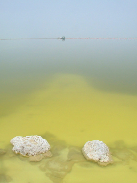 从格尔木出来,基本都侧逆风了,路又差,从盐湖开始,整整几十公里的石子路,风沙还大。到盐湖后,堤岸上都是白花花的,也许是盐,也许就白灰。今天天气并不好,整个天空灰朦朦,已全失去了高原的晴蓝,太阳看起来也闷闷的,所以盐湖并未有想象的湖蓝色,他和天空一样,只是湖面近处的采盐船,才将天湖分割成两处。湖边的盐花有点像钟乳石的质地,只是一片片,还有点像贝壳的堆积。无趣,继续向前。