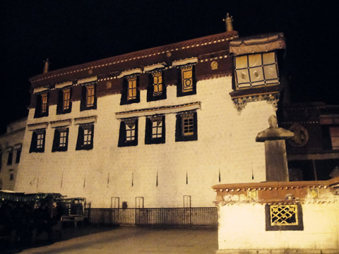小昭寺的灯火不是太亮,我们一行人慢慢退出来……从小昭寺的巷子里出来,可以直接通往八角街,路上同姐和大姐分享了喜悦激动的心情。到了大昭寺前,又前去正大门口看了壁画。寺门口依旧有膜拜的信徒,广场上,游人稀少,偶或地有几人经过。
