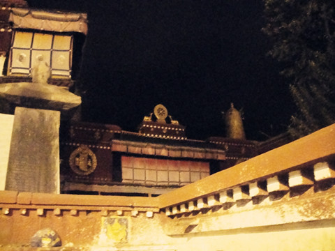 寺院大门已紧锁了,但其中的小门还开着,环顾了四周,便左脚跨进去了。寺院里大灯还亮着,漆黑寂静下衬得墙面发黄,主殿前有数位老人,不知他们在干什么,便慢慢地靠近了。现在才知道,原来他们一干等人在央求寺院喇嘛,希望能进去礼佛,最后同意他们的请求了。
