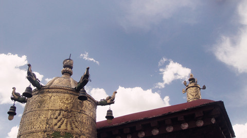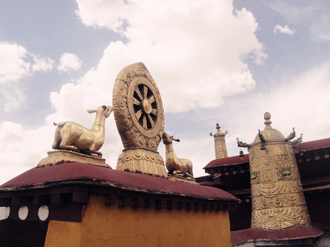 斑驳的金顶没有白鸽,简单地配合着天空,轮廓线平实,时又冒出龙头、金顶、鹿,在明了的蔚蓝色中讲述着神性的故事。去往大昭寺的主殿,是条阴暗的通道,地面上的石头已被磨平近滑,从身边的导游得知,他已有1300多年的历史,那是唐朝和吐蕃的历史,甬道两侧供奉菩萨,酥油灯昏昏发亮,将墙面陈旧的痕迹越发显得古老。