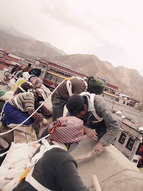 在屋檐处修整土坯的妇女们,手持木板不断地拍打泥石,将他们一一作实,拍匀。在节奏的拍打中,用自己的声音唱响音律,在幡布随风起浪的映衬中,在蓝天下,显得这样原汁原味。用嘹亮来形容,用悠长来形容,回绕在清静的壁画长廊里,以为是那传来的声音。