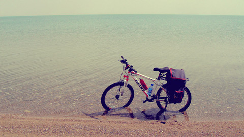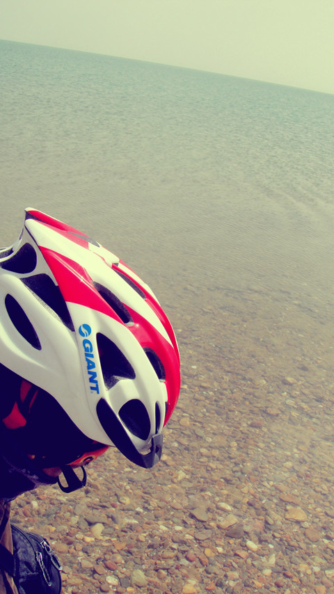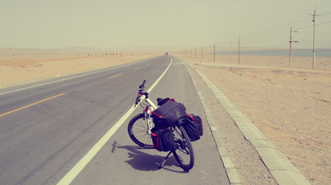在这片大漠盆地,平乏,平乏。除了一如继往的逆向风沙、戈壁,偶尔的修路工人、货车,便再无人烟。正像后来警卫所里的人所说的,这里能做的只是锻炼人的毅力,因为这句话,又扬起斗志,我要一心骑下去,而今天的礼物,是让我感动地要死的清蓝的小柴旦湖。正是昨晚石榴说的有鱼虫的湖,起初还不知他名字,可这确实不重要,重要的是他美得令我疯癫状。