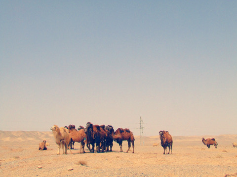 茫茫沙漠边缘,遥无生机的戈壁滩中,还有这样一个湖,湖边国道线对面,有成群的骆驼,他们镇定自若,即使我走近他们身边,也只是张望,正如我看着他们那样看着我,这世上的另一种动物,且如此与众不同。