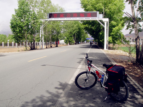早晨在城里找了自行车行见没买链条油,实见时间不晚,就出发了。路上遇见两个从青海骑行上来的骑友,询问了一些路况,他们又送了半瓶链条油,两个刹车块,挖外胎的铁撬,太谢谢他们了!听说运气好从这里到格尔木大部分都是下坡顺风,哈哈……而今天也都是顺风,坡度也不大,却骑行得酸痛,也许已经三天没骑养着了,看来兵还得天天练呢!