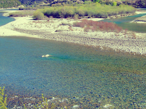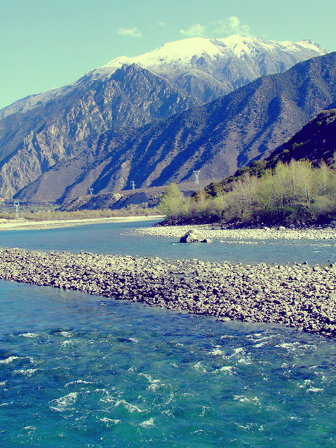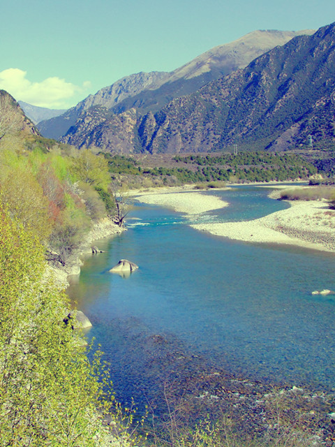 尼洋河的波涛已归于平静,河床两岸的石头干枯,无声、无色,我停下车,其实之前并未有意,我摸寻着心怡的石头,将他们浸在水中一一尝试,最后竟有六七块,我舍不得便全部装上了。走了两公里不到,看着后胎,又开始心疼了…于是念了一声“南无阿弥陀佛”,便将其中一块放于路边,也许我们真无缘,回归自然去了……可又在原地绕了半会儿,终于又捡起另一块。