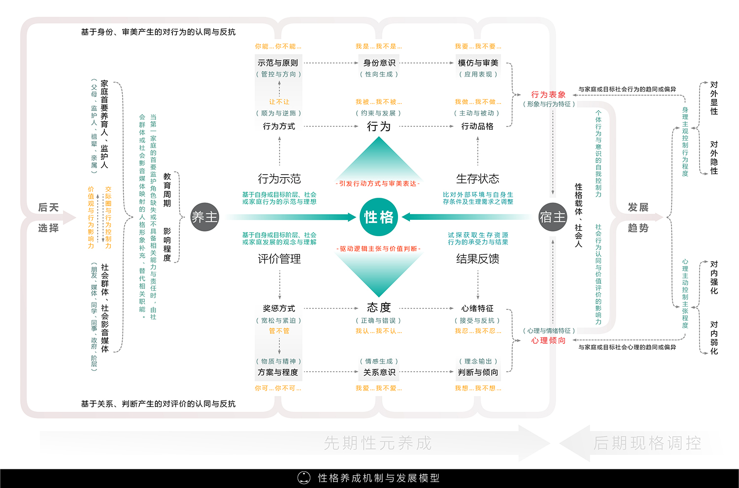 在童瓣-《性格养成机制与发展模型》,我们可以看到孩子在“生存状态”-“比对外部环境与自身生存条件及生理需求之调整”与“结果反馈”-“试探获取生存资源行为的承受力与结果”中分别衍生行动品格和心绪特征,在生命与生俱来的生存意识下:怎么活、能不能活、如何活地更好…是生命先天的发展诉求,由此而衍生的行动特征和心绪表现都是源于这一初衷和试探的反馈,进而形成行为与思维惯性,这是孩子自我的差异化的内部与先天要因。而基于此的生存努力和探求,也进一步促使了孩子会在这一过程中寻找有利于自身发展的优势和能力,这便是自我差异化的自身要因。